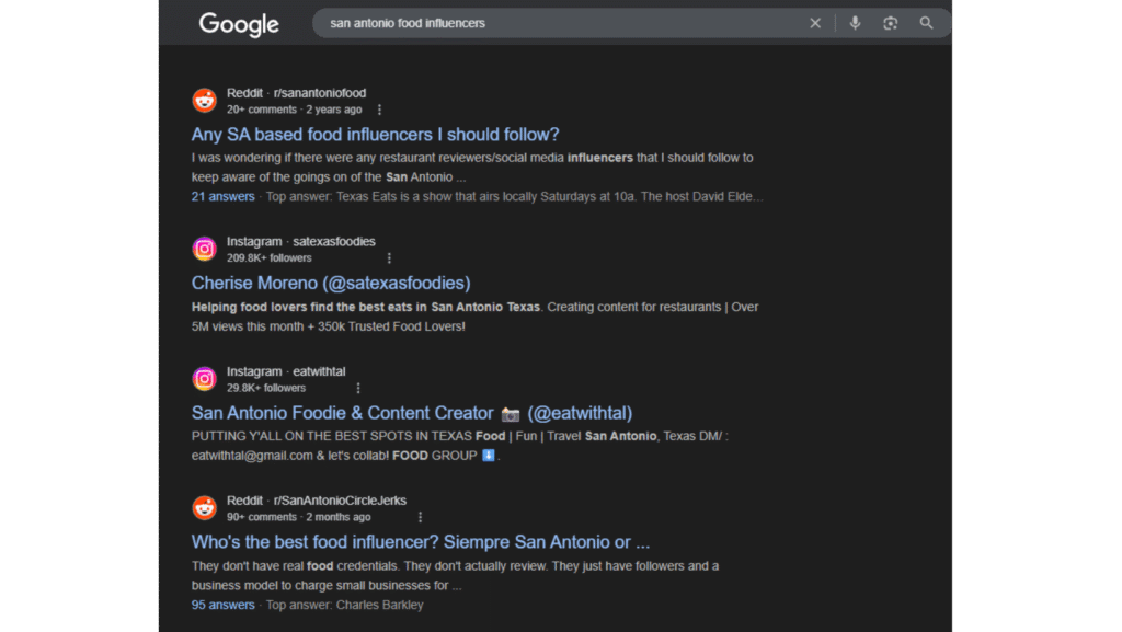 Using search terms like “best restaurants in San Antonio” or “top 5 best restaurants in San Antonio” will often pull up food blogs by local restaurant influencers (alongside the more generic results like TripAdvisor). You can also simplify things with more straightforward search terms like “food influencers in San Antonio,” for example!